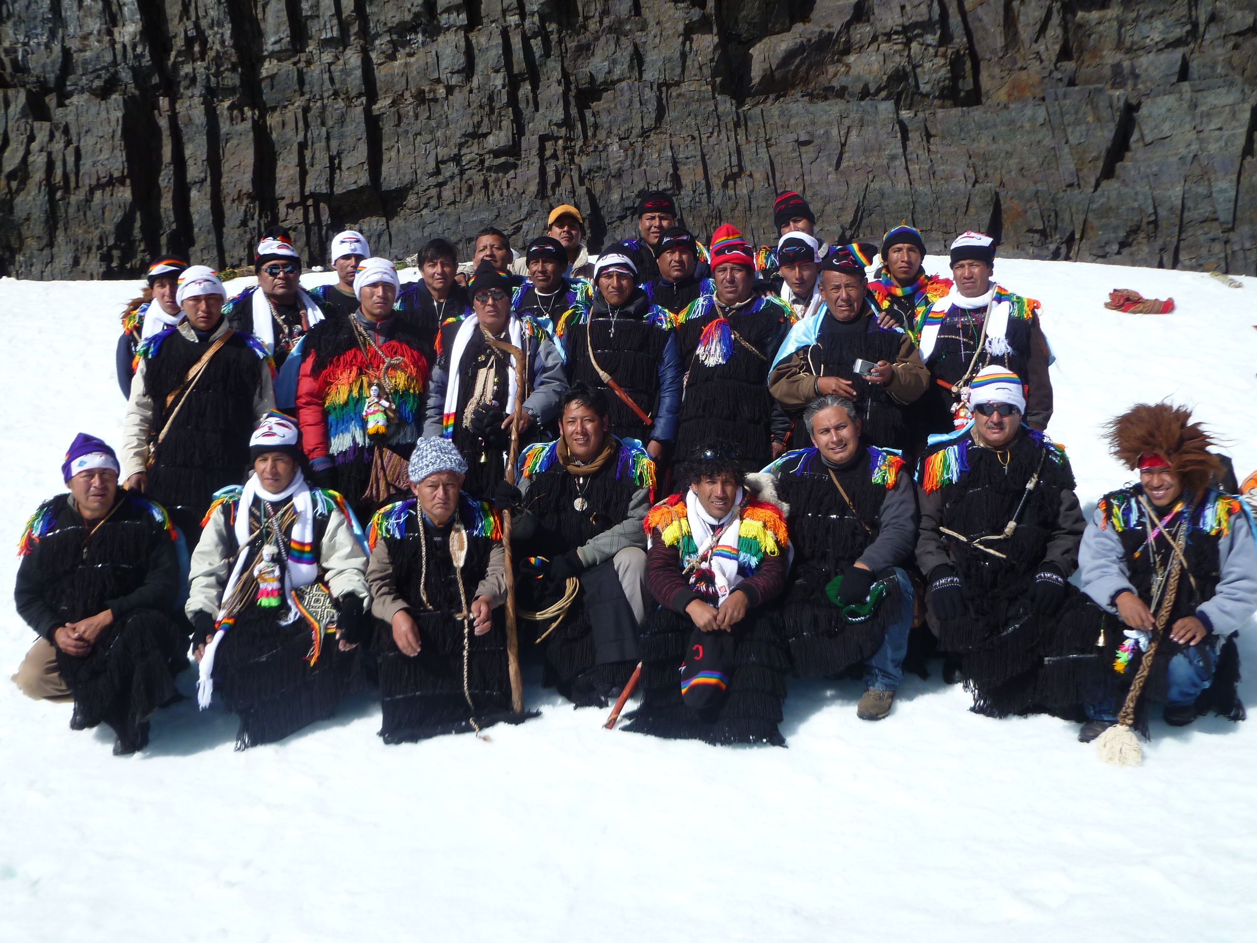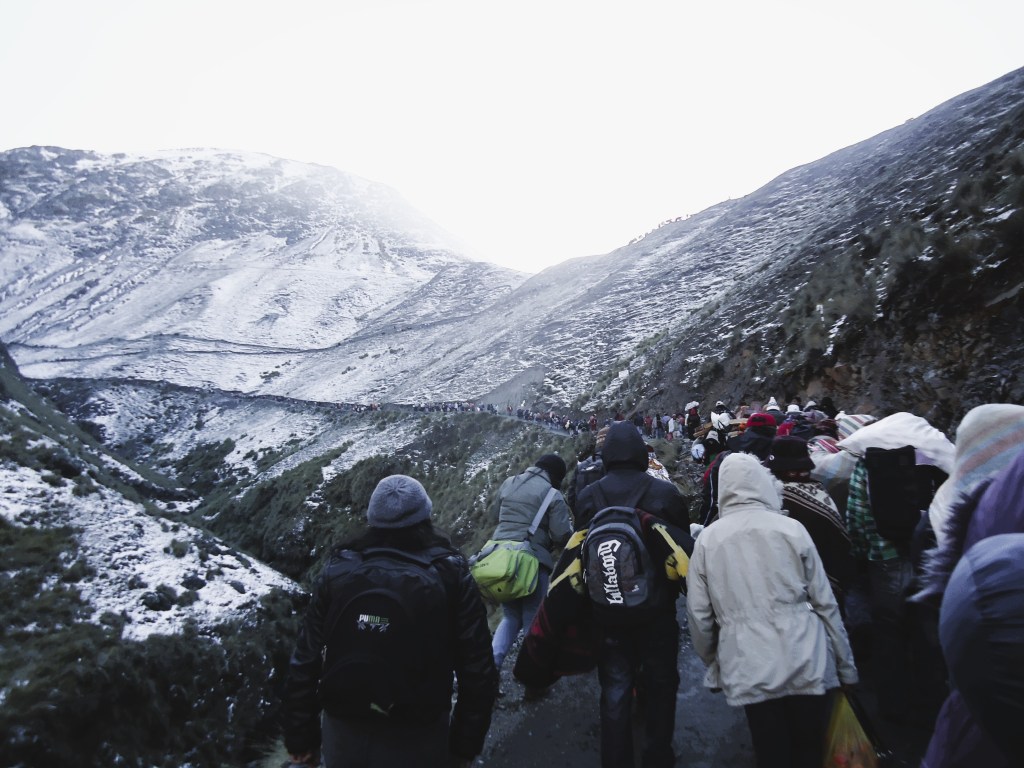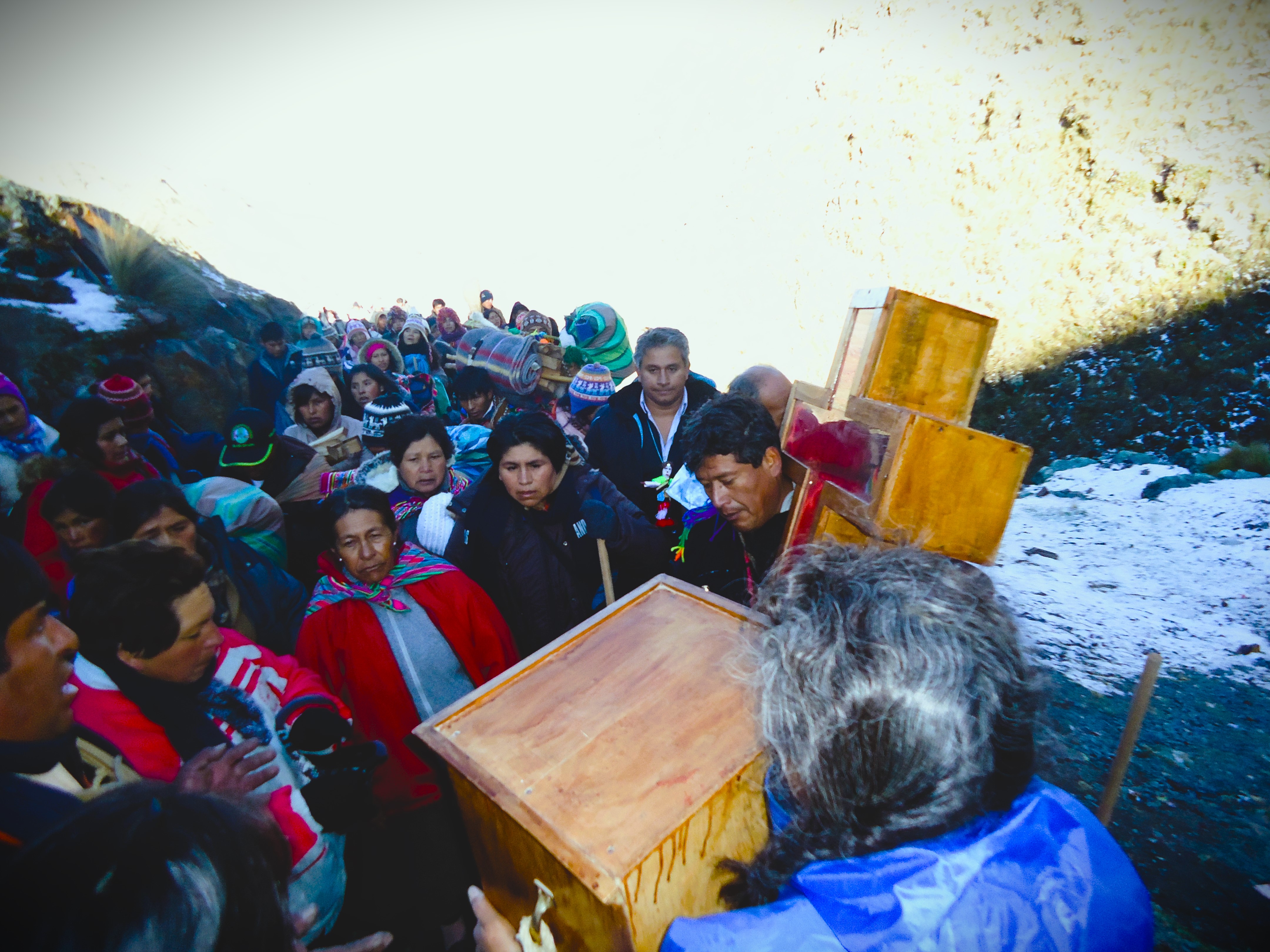 La imagen documenta la jornada de nuestra hermandad durante el viaje a nuestro señor de Qoyllur Rit’i en 2012. Esta travesía andina no es solo un acto de fe individual, sino un compromiso que nos hermana con miles de peregrinos y diversas naciones de «Pablitos» (danzantes) que confluyen anualmente. El ascenso a través de los nevados, más allá de ser una prueba física, es la renovación de una tradición ancestral que une la devoción al Señor de Qoyllur Rit’i con la reverencia a los Apús tutelares. Para el mundo andino, esta peregrinación representa el pulso vivo de la fe regional, un testimonio de la perseverancia cultural y espiritual que se fortalece colectivamente al compartir el camino con otras hermandades y naciones.