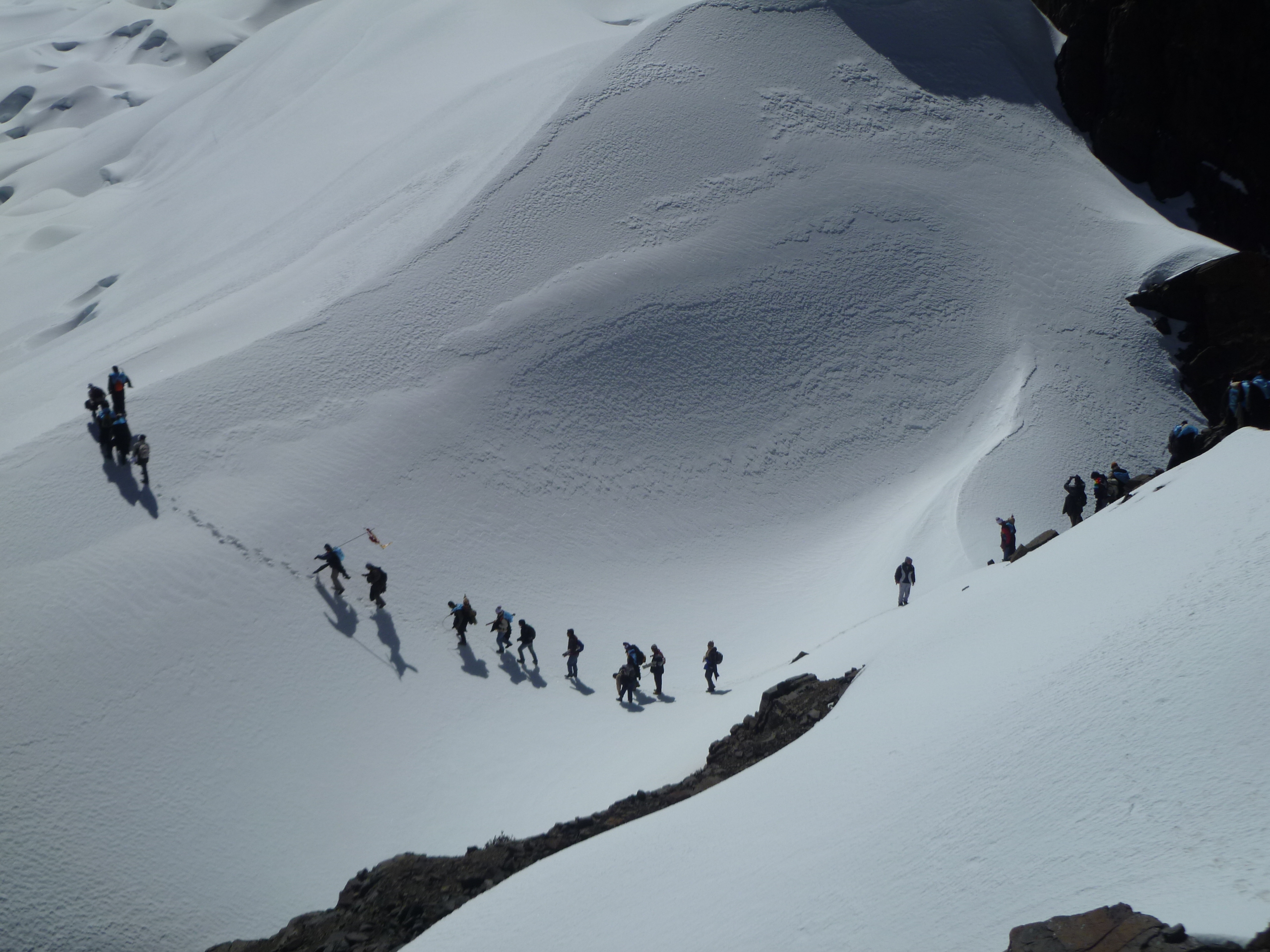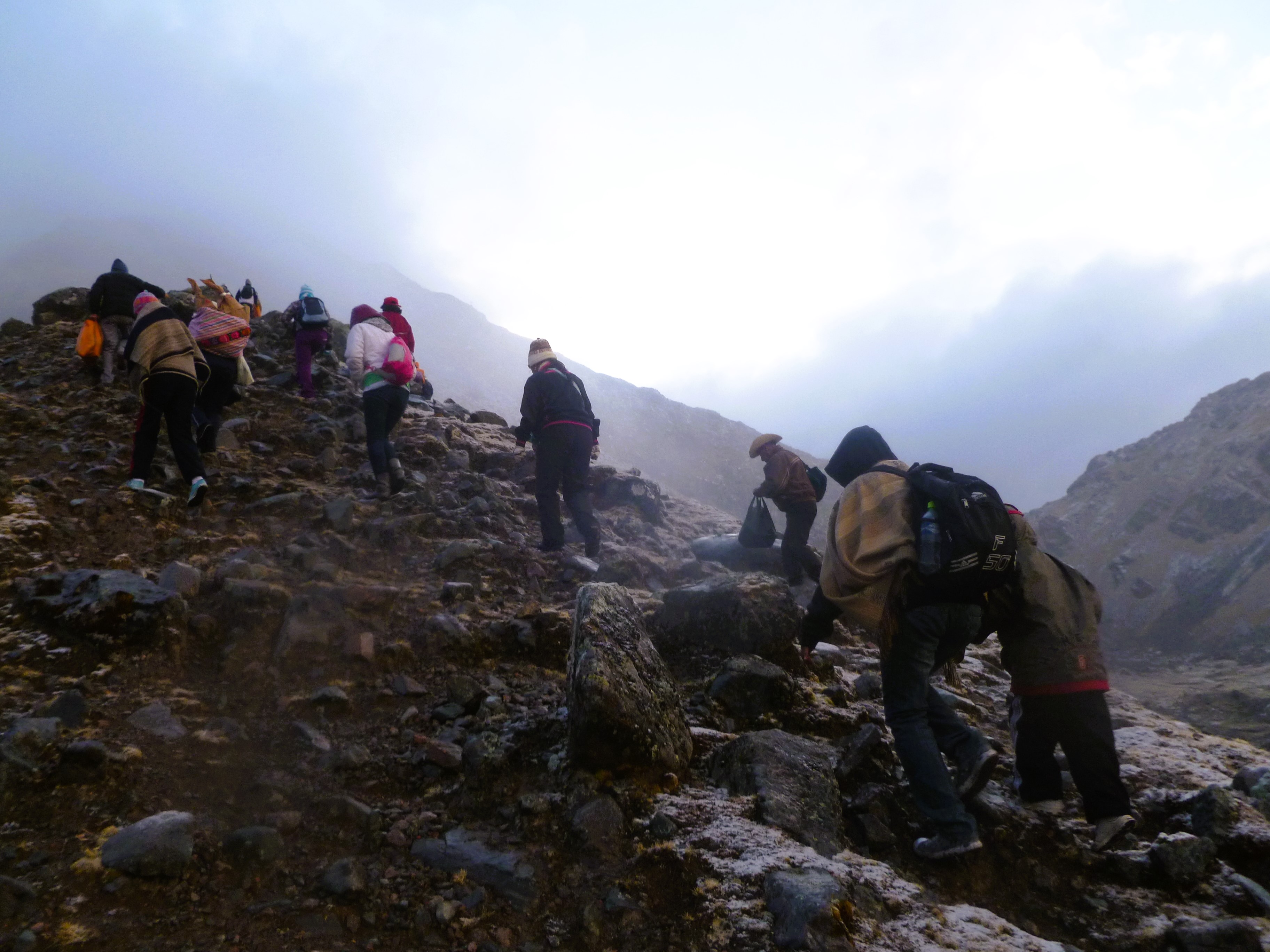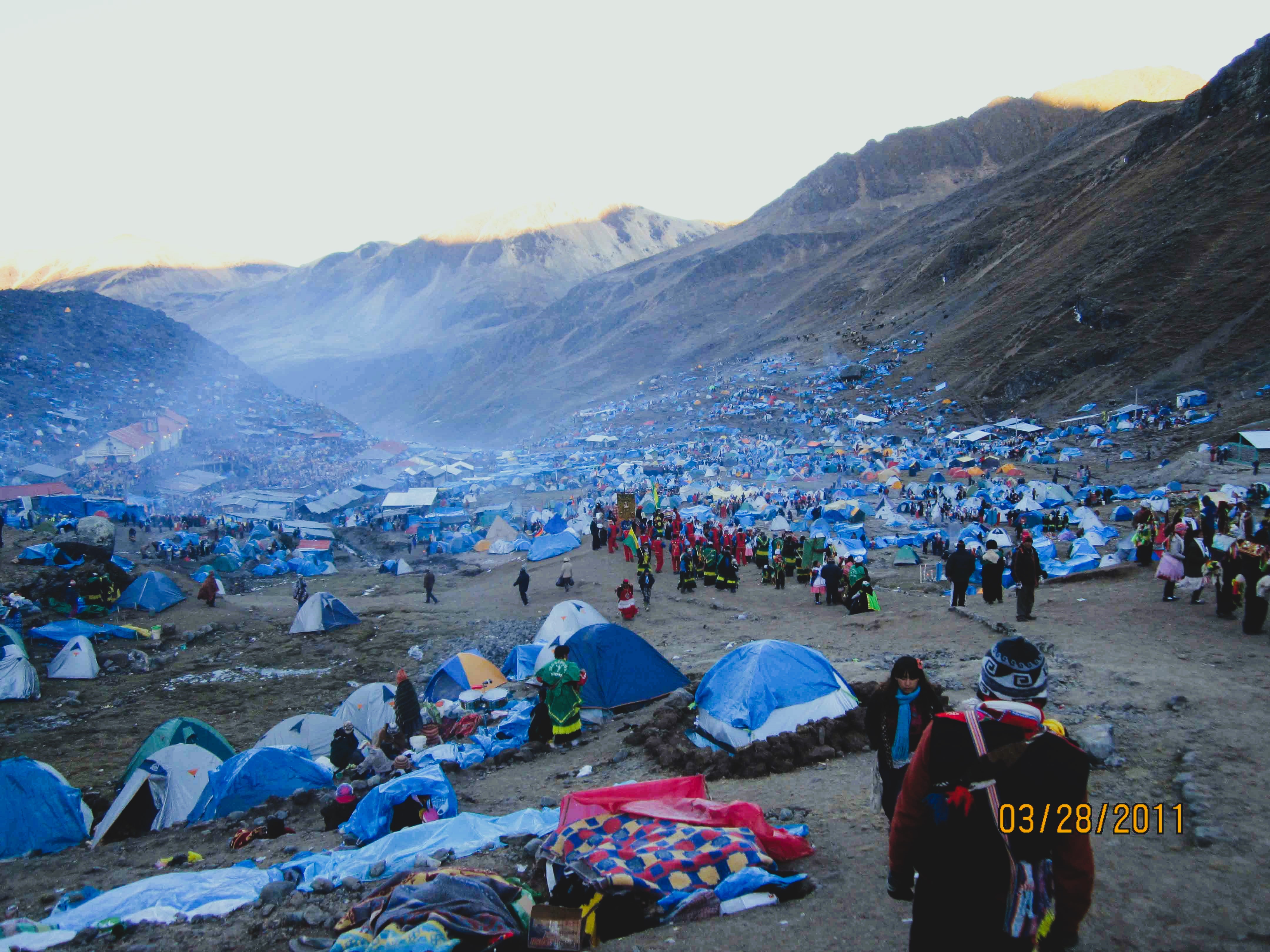 La imagen documenta la jornada de nuestra hermandad durante el viaje a nuestro señor de Qoyllur Rit’i en 2012. Esta travesía andina no es solo un acto de fe individual, sino un compromiso que nos hermana con miles de peregrinos y diversas naciones de «Pablitos» (danzantes) que confluyen anualmente. El ascenso a través de los nevados, más allá de ser una prueba física, es la renovación de una tradición ancestral que une la devoción al Señor de Qoyllur Rit’i con la reverencia a los Apús tutelares. Para el mundo andino, esta peregrinación representa el pulso vivo de la fe regional, un testimonio de la perseverancia cultural y espiritual que se fortalece colectivamente al compartir el camino con otras hermandades y naciones.
