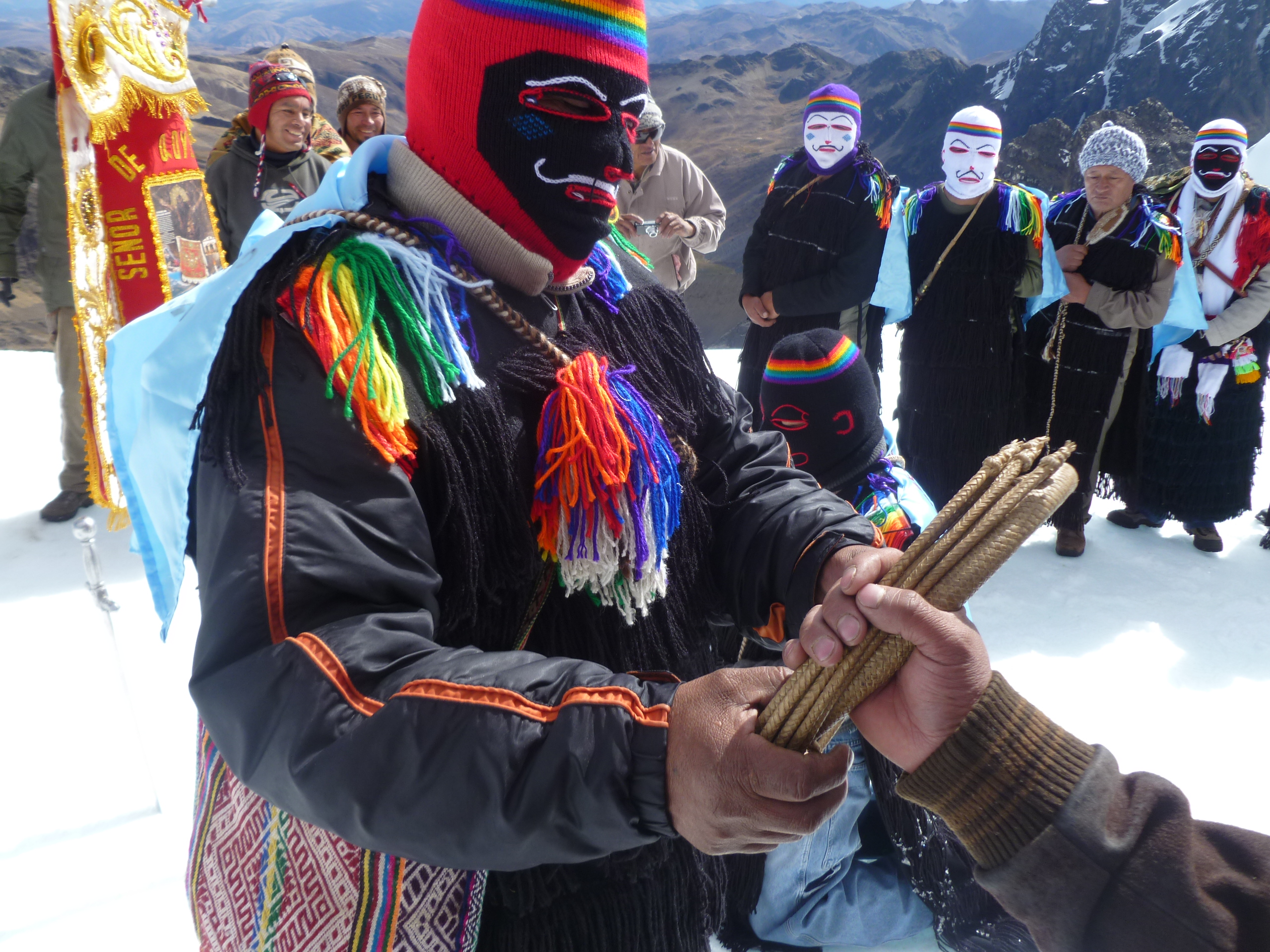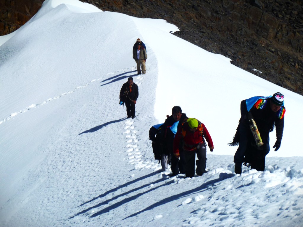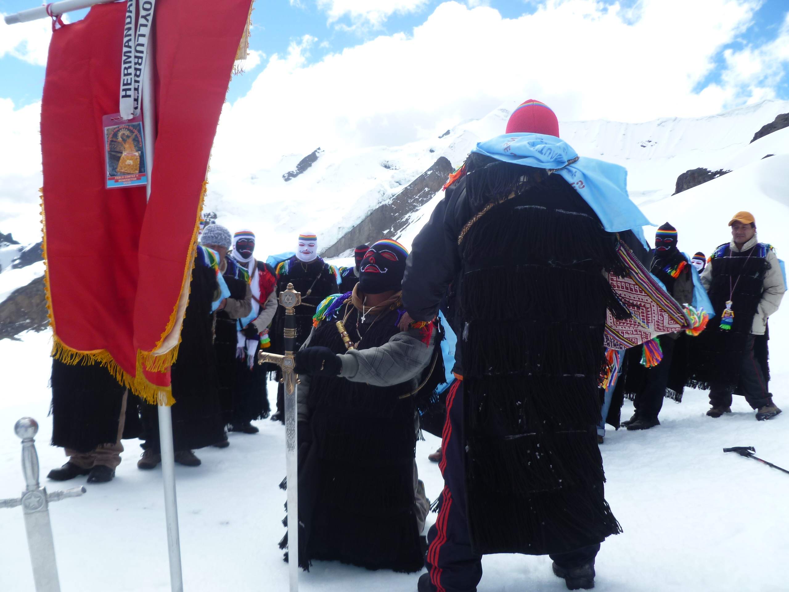 La imagen captura un momento del trayecto que anualmente emprenden los miembros de nuestra hermandad hacia el Santuario del Señor de Qoyllur Rit’i. Esta peregrinación, considerada una de las más grandes manifestaciones de fe de los Andes, es un compromiso que nos exige superar la altura y el hielo como prueba de devoción. Cada paso sobre el nevado es una renovación de la promesa espiritual, fusionando la fe en Cristo con la profunda reverencia a los Apus (las montañas sagradas). Esta travesía no es solo un acto de sacrificio, sino una fuente de inspiración y fortaleza que refuerza la unidad de nuestra comunidad y el vínculo inquebrantable con nuestras tradiciones ancestrales y cristianas.